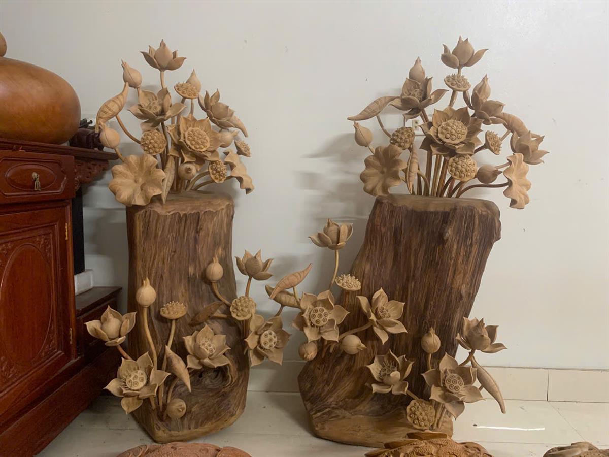 - Tên sản phẩm: Cặp bình hoa sen phong thuỷ gỗ Ngọc Am