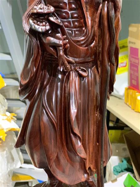 Kích thước & tạo hình: Ngài Trường Mi đứng trên đá vững chãi, tay cầm tích trượng và linh chi – biểu tượng cho phúc lộc và trường thọ.