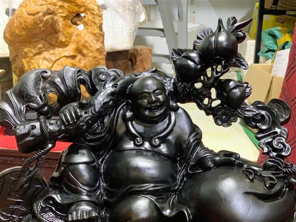 Tượng Phật Di Lặc gỗ Mun Sừng Khánh Hòa liền khối, ngồi gánh Đào Tiên trên núi vàng, bao tiền. Ý nghĩa phong thủy chiêu tài lộc, may mắn, phú quý