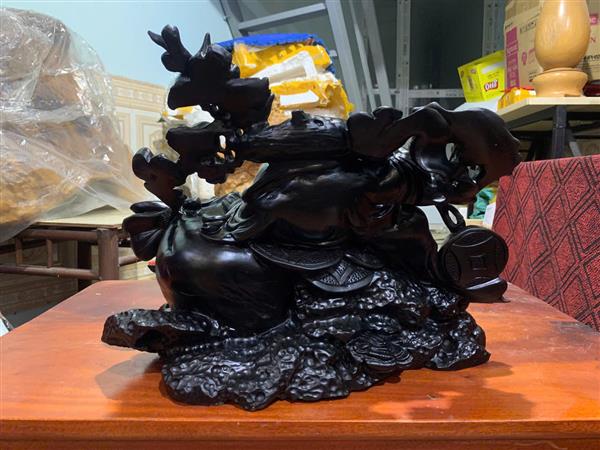 Tượng Phật Di Lặc gánh Đào Tiên ngồi trên Núi Vàng & Bao Tiền, Gỗ Mun Sừng Khánh Hòa liền khối