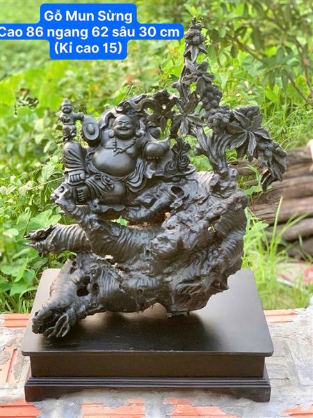 Tác phẩm Phật Di Lặc gỗ Mun Sừng độc đáo, chế tác thủ công tỉ mỉ, liền khối từ gỗ Mun Sừng Khánh Hòa quý hiếm. Hình tượng Phật Di Lặc ngồi trên củ Nhân Sâm ngàn năm mang ý nghĩa may mắn, bình an, chiêu tài lộc, sức khỏe trường tồn.