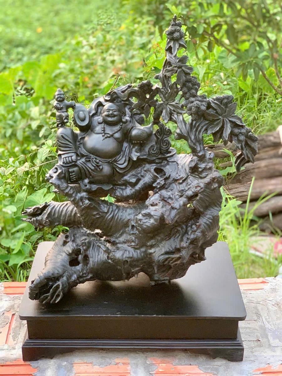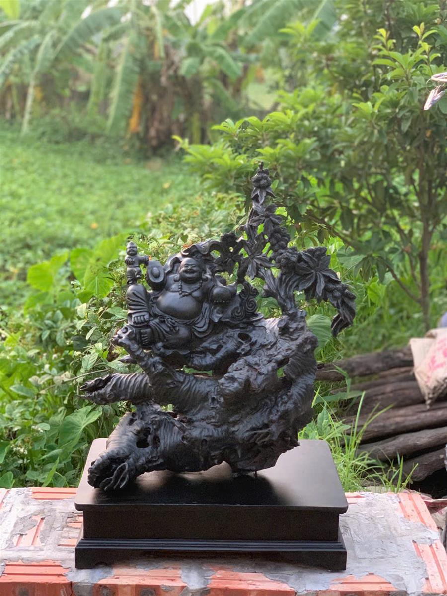 Tượng Phật Di Lặc gỗ Mun Sừng Khánh Hòa ngự trên củ Nhân Sâm ngàn năm, tác phẩm phong thủy cao cấp, chiêu tài lộc, bình an, may mắn