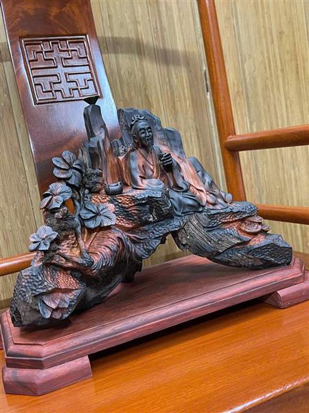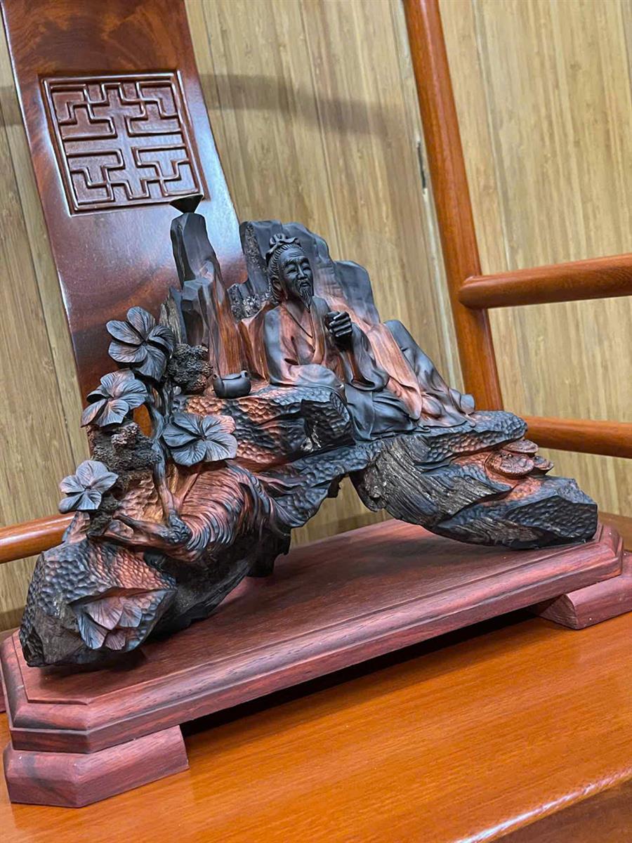 Tượng Thần Trà gỗ Trắc đỏ đen liền nguyên khối, có xông trầm, tác phẩm phong thủy cao cấp, biểu tượng trí tuệ, an nhiên, chiêu tài lộc