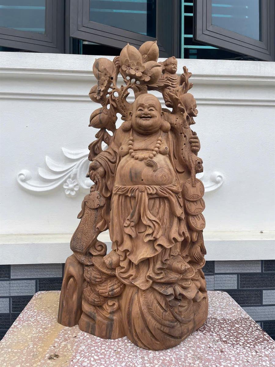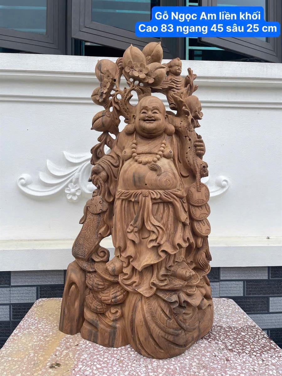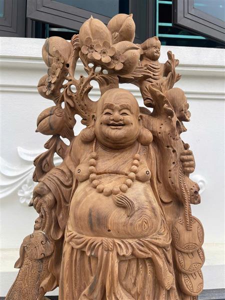 👉 Tượng Phật Di Lặc đứng vác cành đào, chất liệu gỗ Ngọc Am nguyên khối, chạm đục hoàn toàn thủ công.
