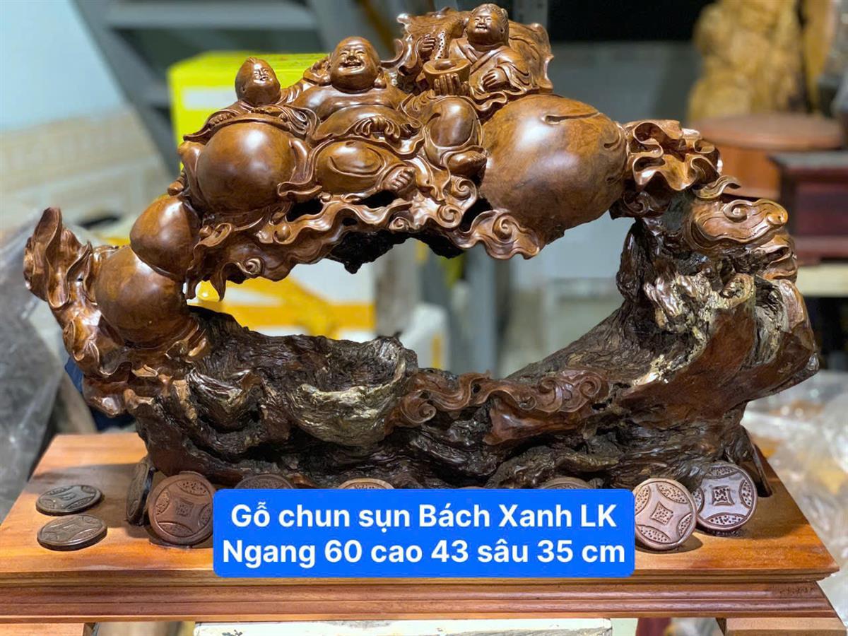 May mắn cơ sở Nét Mộc đã sưu tầm được một phôi gỗ Sụn Bách Xanh và tạo nên tác phẩm: Tượng Phật Di Lặc Ngồi với 2 tiểu đồng nam nữ 2 bên, cùng với bao tiền, hồ lô, ấm tích để thể hiện đa dạng về sức hút tiền tài, lộc bổng cùng cuộc sống hạnh phúc vui tươi. Một tiểu đồng Nam, một tiểu đồng Nữ thể hiện sự cân bằng trong cuộc sống.