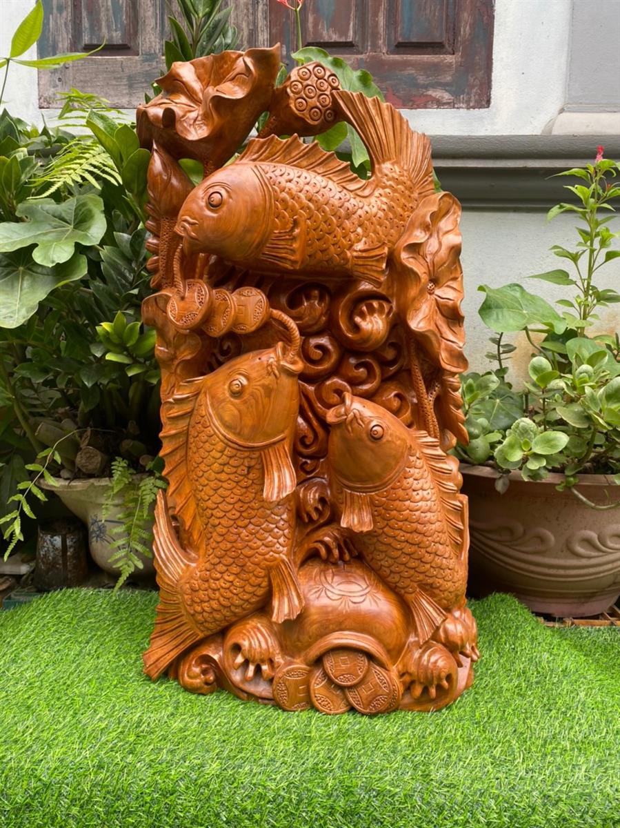 Tượng Tam Ngư Vờn Ngọc Gỗ Ngọc Am Liền Khối Thơm Nức Mũi, Tam Ngư Tài Lộc Gỗ Ngọc Am