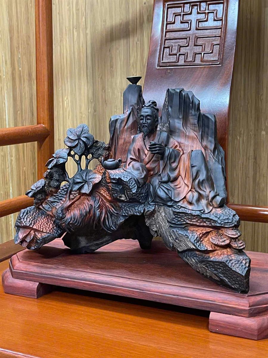 Tượng Thần Trà gỗ Trắc đỏ đen liền nguyên khối, có xông trầm, tác phẩm phong thủy cao cấp, biểu tượng trí tuệ, an nhiên, chiêu tài lộc